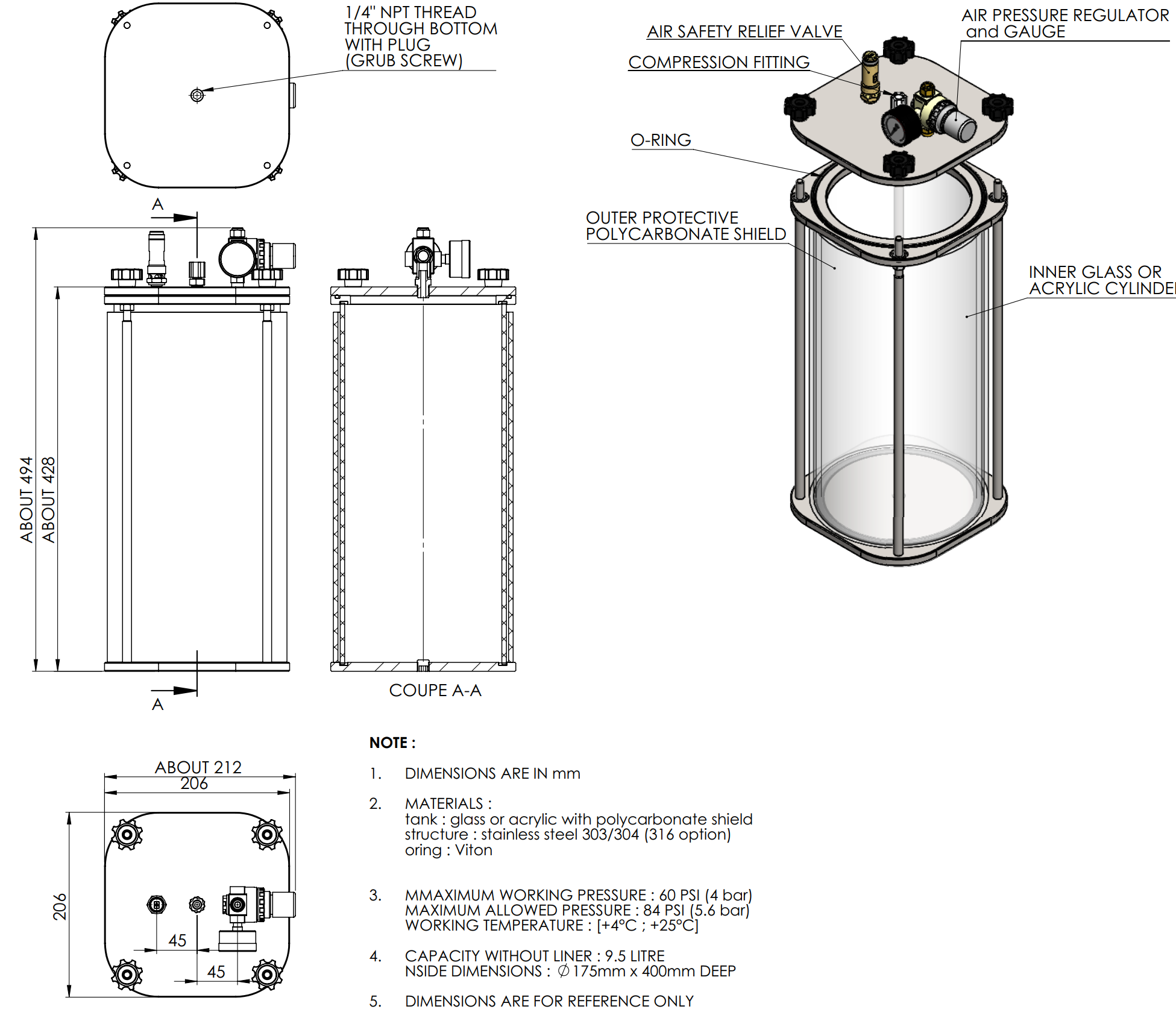 The tanks are made of stainless steel 303 and Acrylic tubes and can be pressurised up to 3 bars. CT Tanks Series can operate to 28°C.
